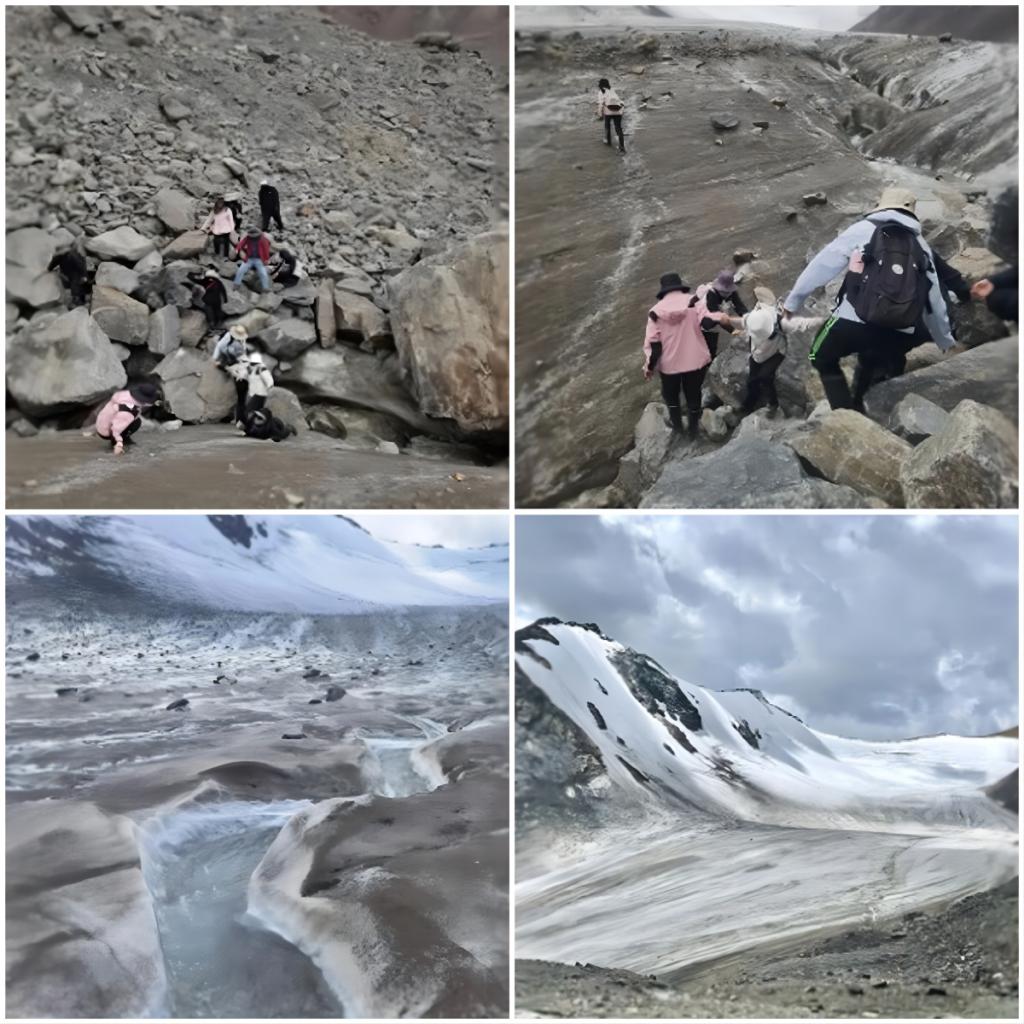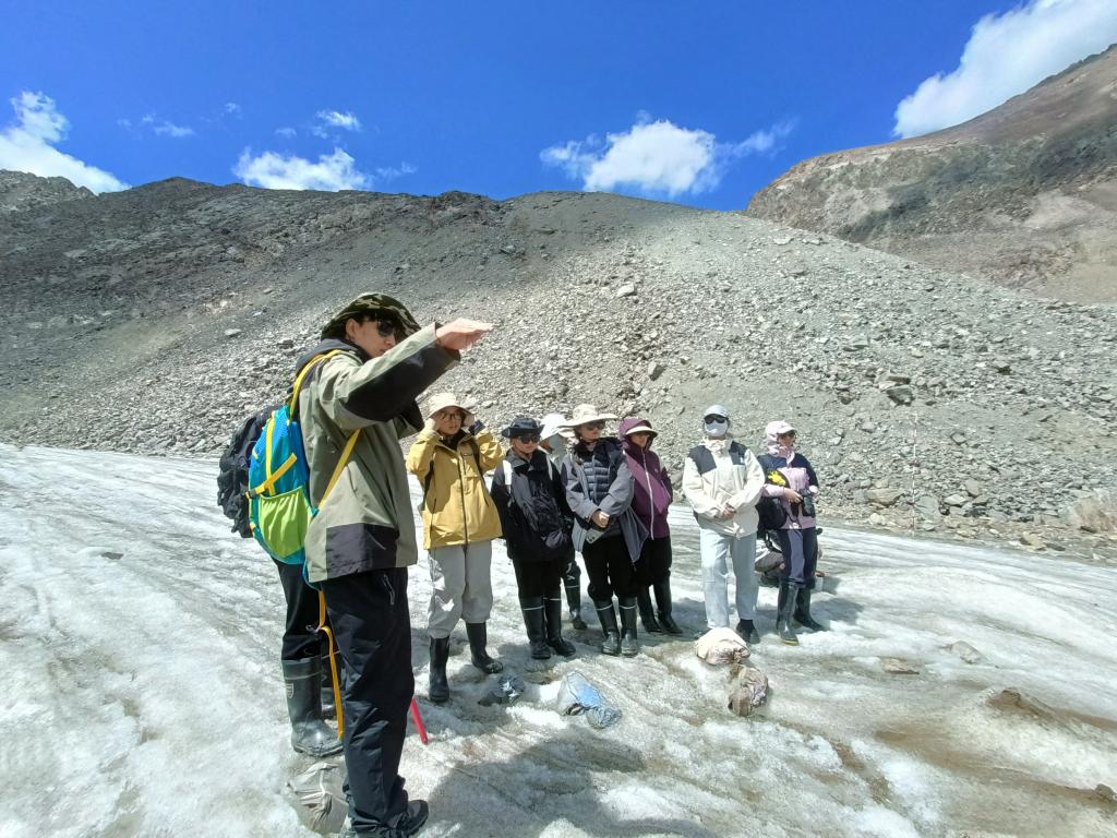 天山乌鲁木齐河源1号冰川海拔3800米以上,可以看到成层的槽谷、岩坎、岩盆、冰斗及状似绵羊脊背的羊背石等冰蚀景观,并保存着各个时期的冰川堆积物。天山1号冰川上的冰碛以岩石、碎石和泥土为主。天山站的带队老师详细介绍了最近50年来1号冰川的消融过程和消融速率观测研究结果,以及导致冰川快速消融的人为因素和自然因素。师生深入冰川积累区、水文断面和水准点等地,实地观测了冰川的表面特征、物质平衡、冰川水文及冰川末端变化等现象。通过亲身体验和实际操作,同学们对冰冻圈科学研究的全过程有了基本认识,并积累了宝贵的实践经验。