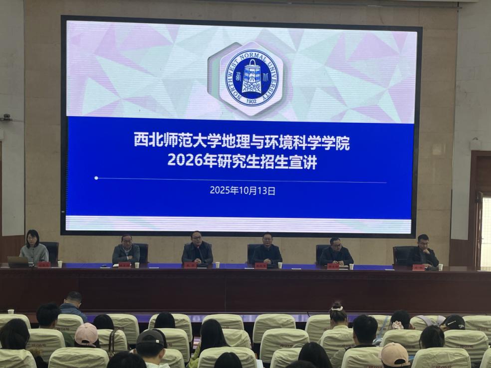 2025年10月13日,西北师范大学地理与环境科学学院院长姚晓军教授带领党委副书记、行政副院长谢文涛等一行4人莅临我院,开展2026年硕士研究生招生专项宣讲活动。此次活动旨在深化两校在资源与环境科学、地理学等领域的学术合作,吸引优质生源报考西北师范大学相关学科,同时为我院师生提供精准的升学指导与政策解读。我院领导班子成员、各系主任及2026届毕业生代表共300余人,在2号报告厅参加了本次宣讲会。